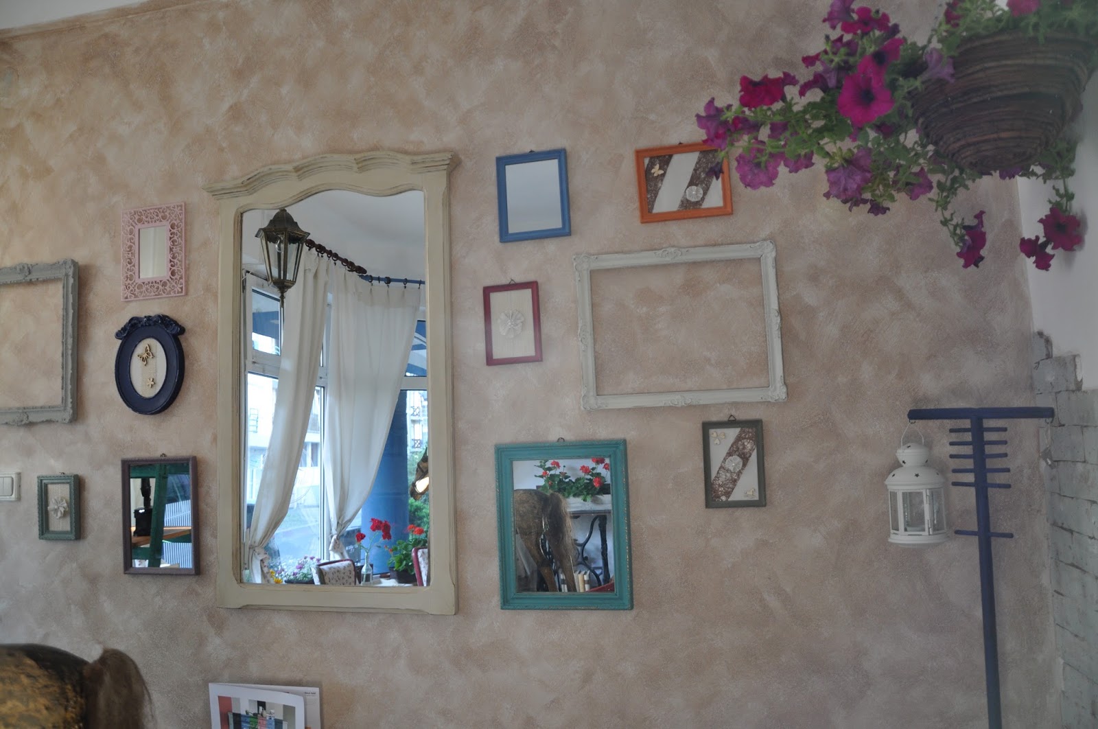 A díszítő téglaszeleteket Paris Grey-jel díszítettem és színesre pingáltam a képkereteket és a karnisokat is.