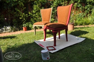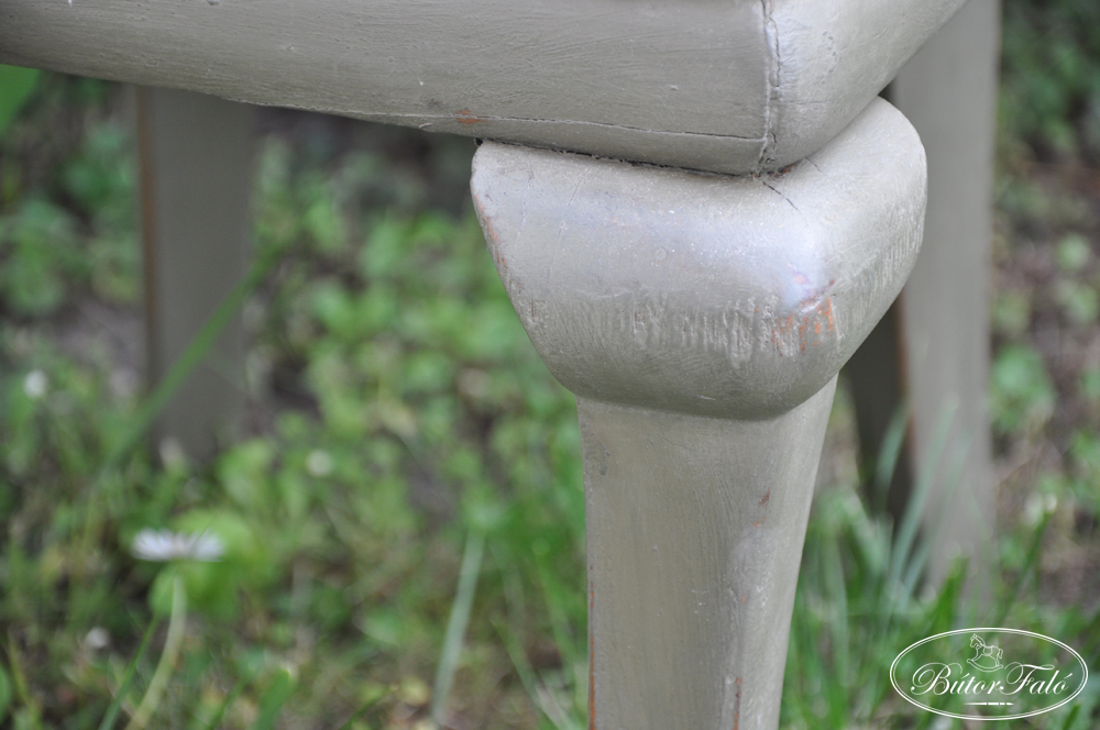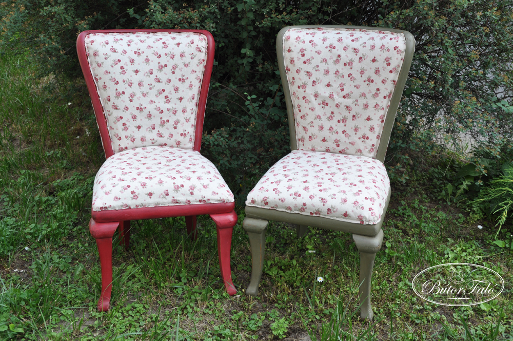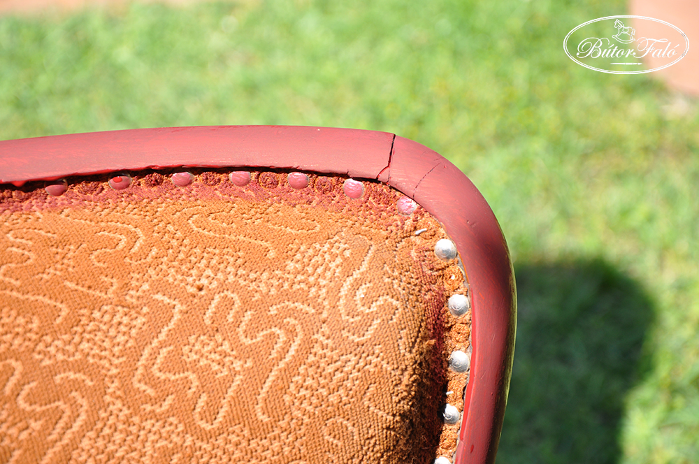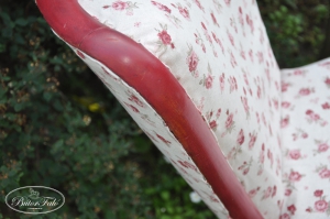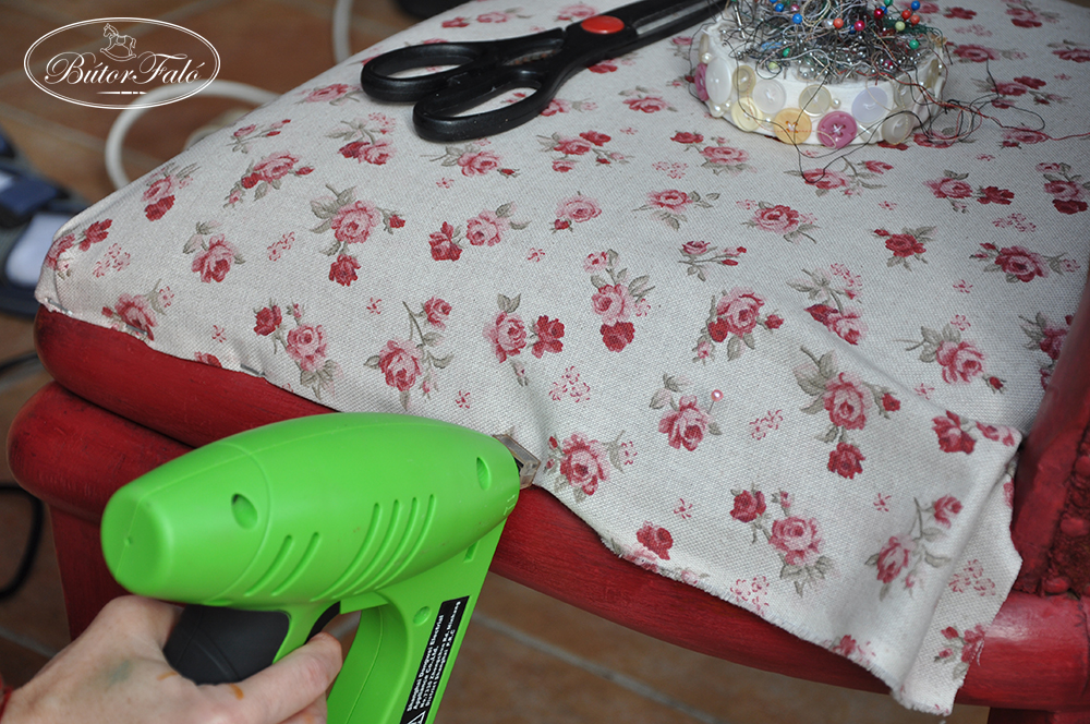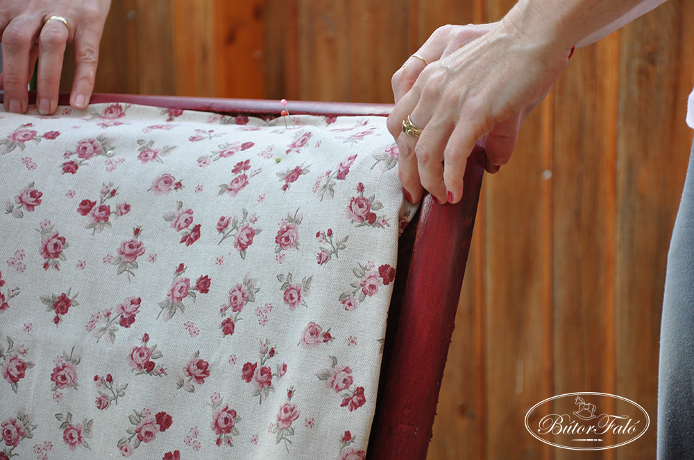 Úgy gondoltam, hogy mivel a kárpitozásban nem vagyok még elég jártas, nem szedem le a régi szövetet. Találtam egy kedves, rózsás vásznat és a minta színéhez igazodva Emperor’s Silk és Olive színekkel festettem be a farészeket, majd waxoltam. A nagyvonalúan leszabott vásznat tűzőgéppel rögzítettem, a rögzítést bortnival takartam el. Ilyen lett: